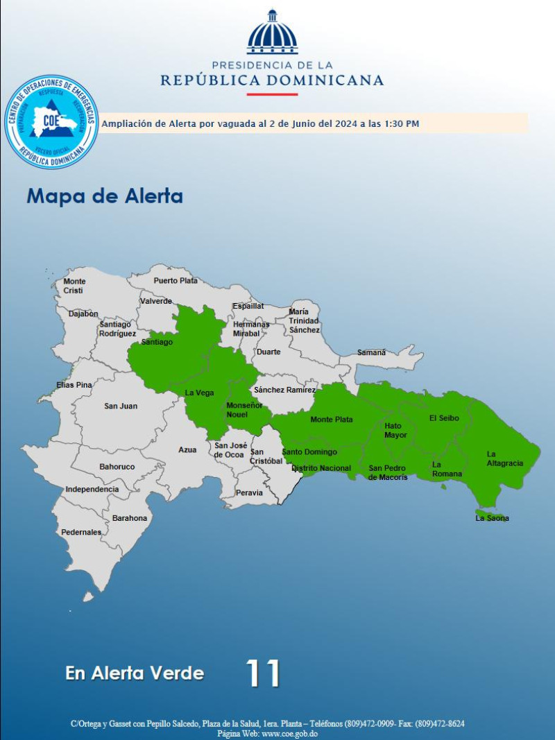 Las provincias en alerta verde son Santiago, Monseñor Nouel, San Pedro de Macorís, La Romana, La Altagracia, La Vega, Hato Mayor, El Seibo, Monte Plata, Santo Domingo y Distrito Nacional.