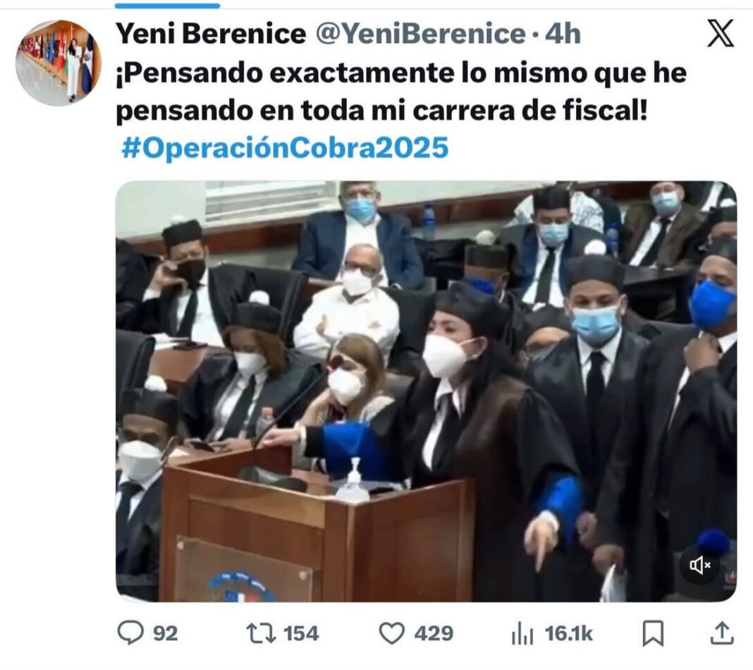 «¡Pensando exactamente lo mismo que he pensado en toda mi carrera de fiscal!», escribió la magistrada en una publicación que acompaña el video, difundido en su cuenta de X con el hashtag #OperaciónCobra2025.